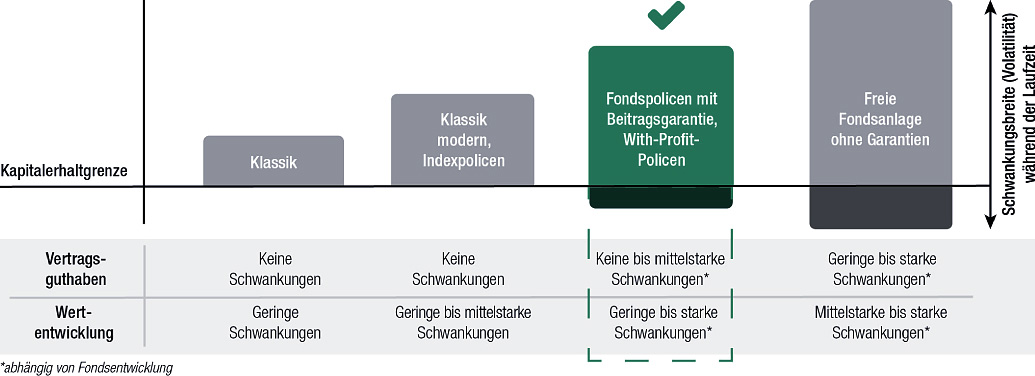 • Jährliche Ertragsschwankungen möglich, Begrenzung des Wertzuwachses auf garantierte Mindestwertentwicklung möglich